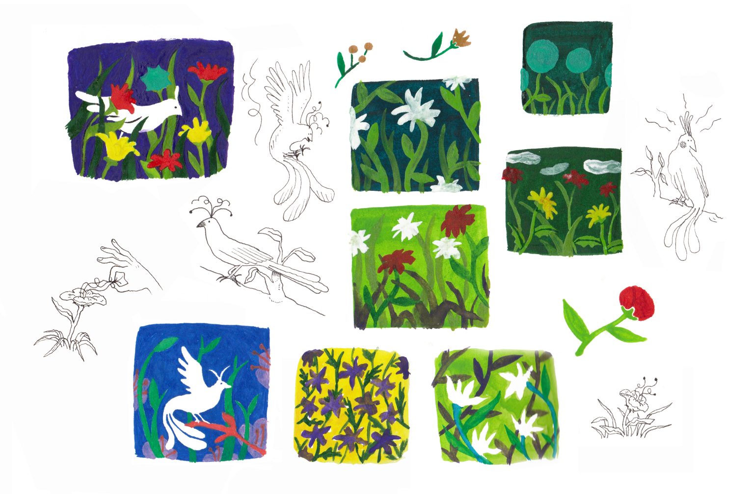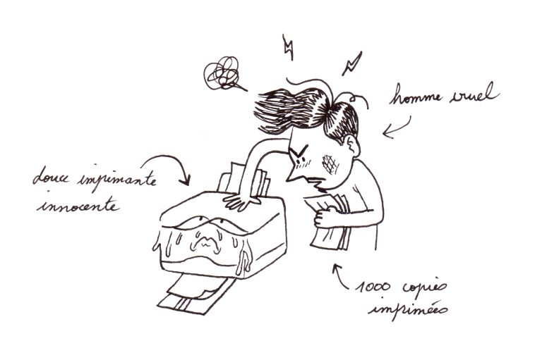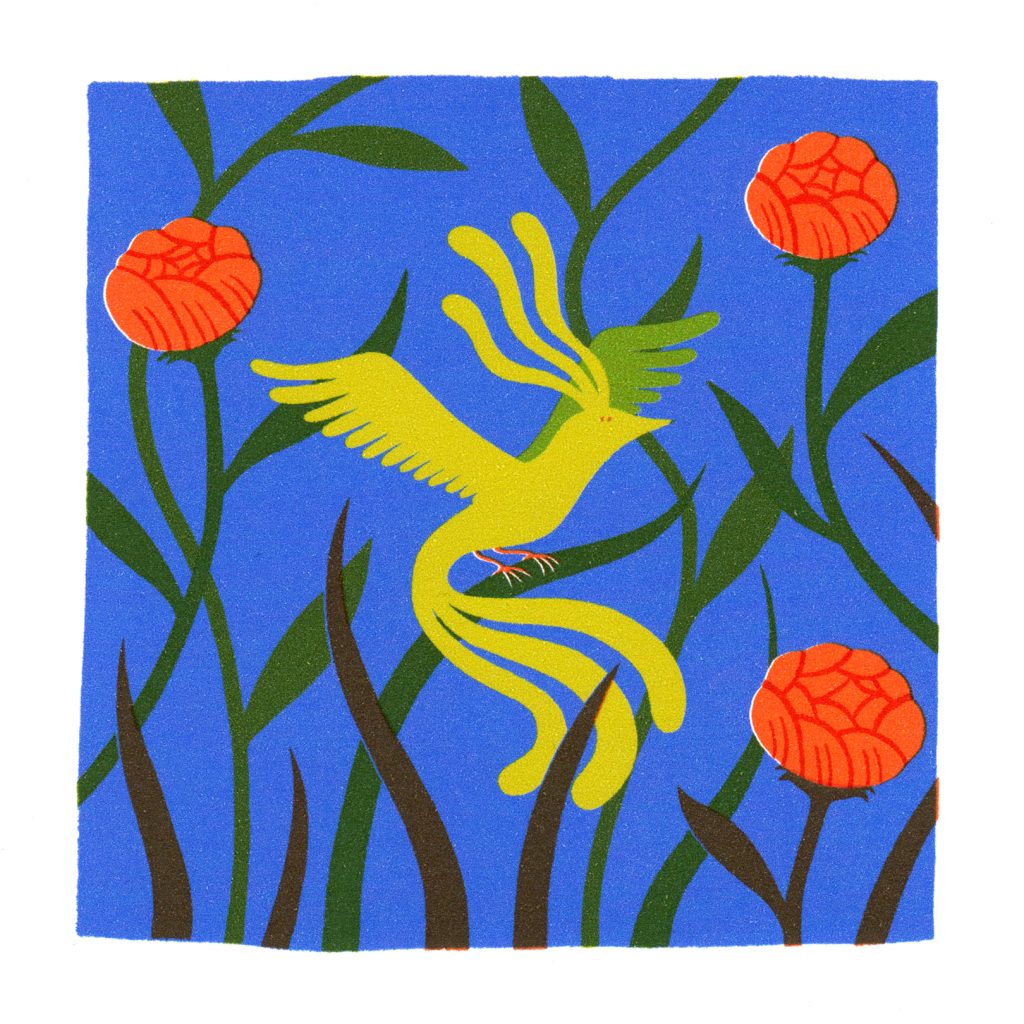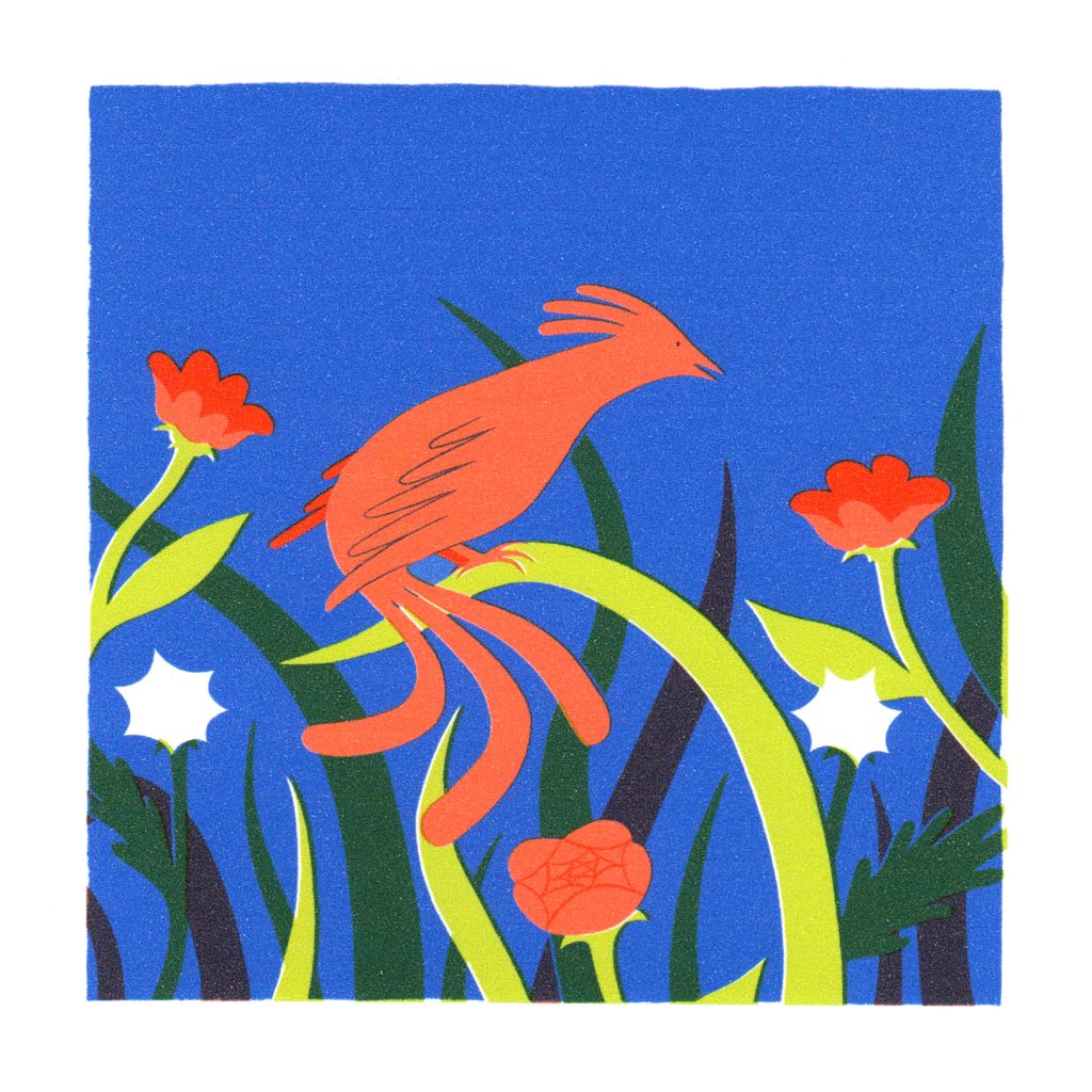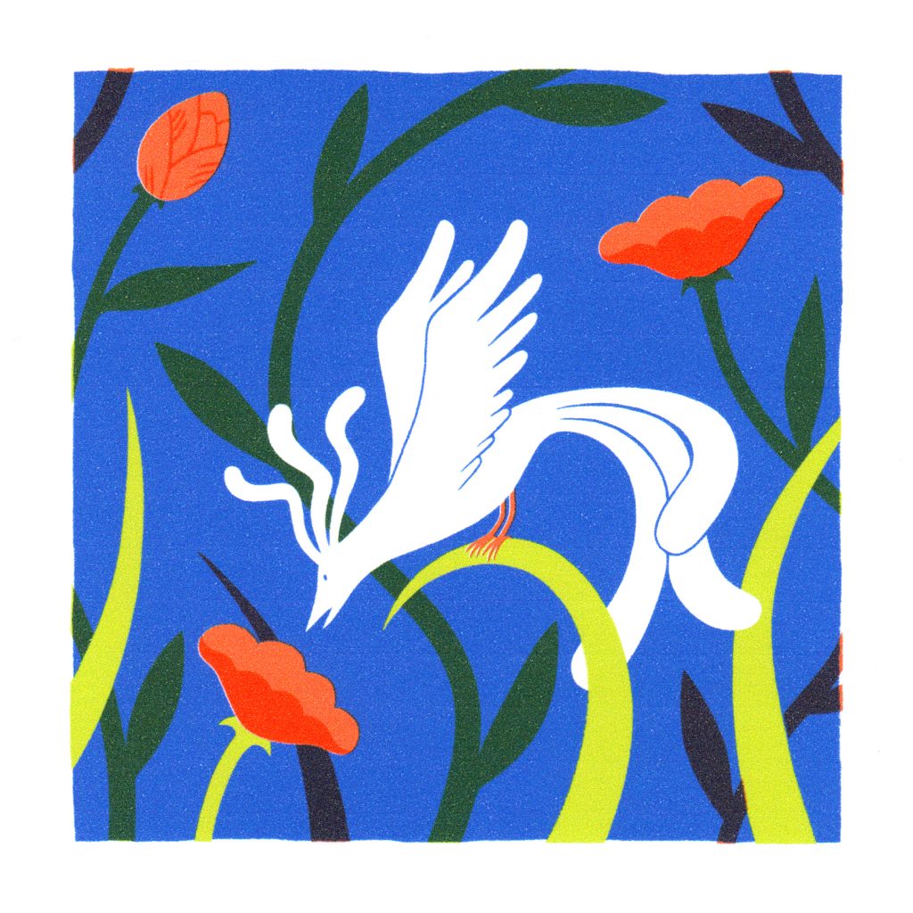 Visuellement je voulais un rendu proche de la sérigraphie: des couleurs vives, les effets de décalages et superpositions des couleurs et la texture de l’encre sur le papier. Dans cette idée j’ai imité le procédé en imprimant les couleurs séparément sur une même feuille et laisser la machine créer ces petits accidents qui donnent du charme au résultat final.