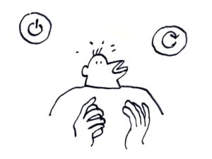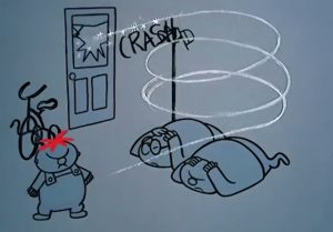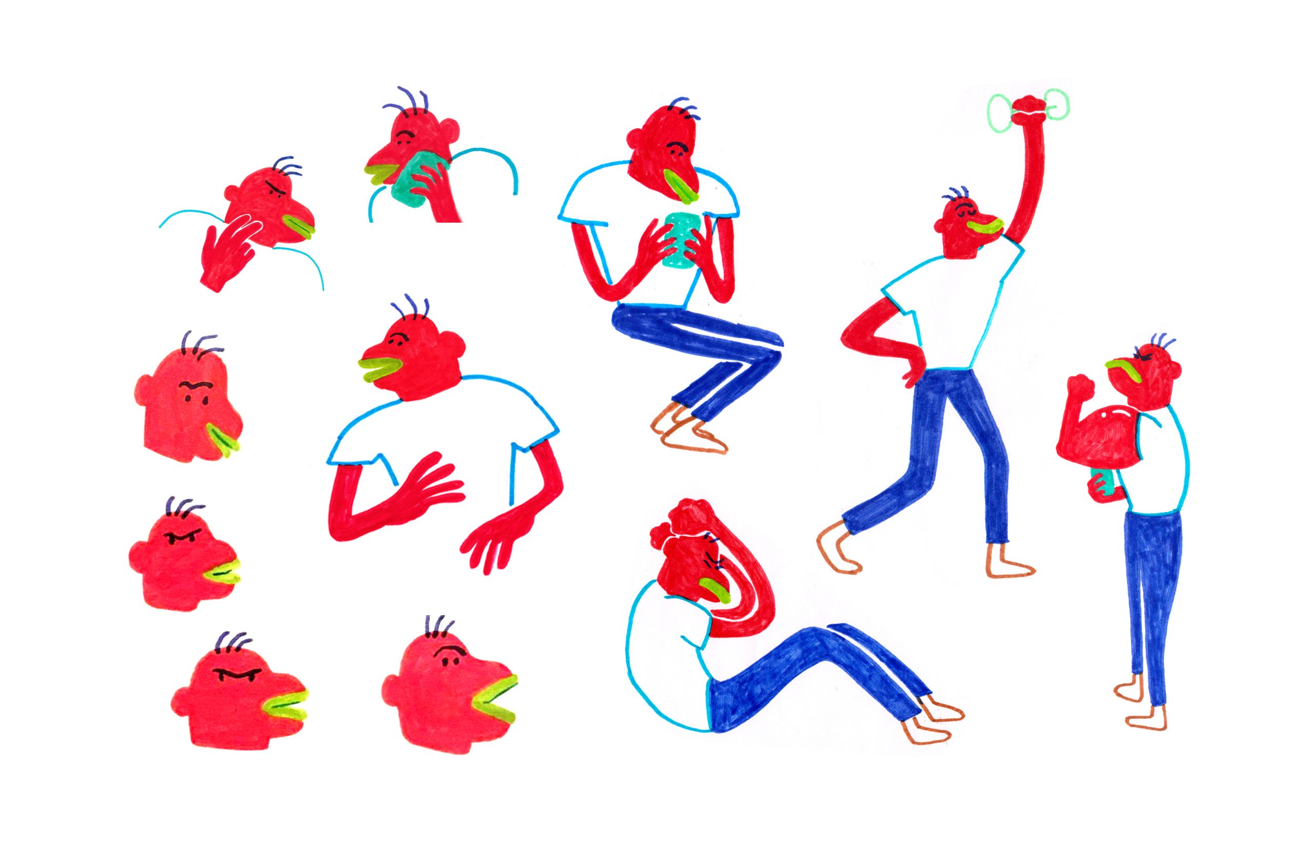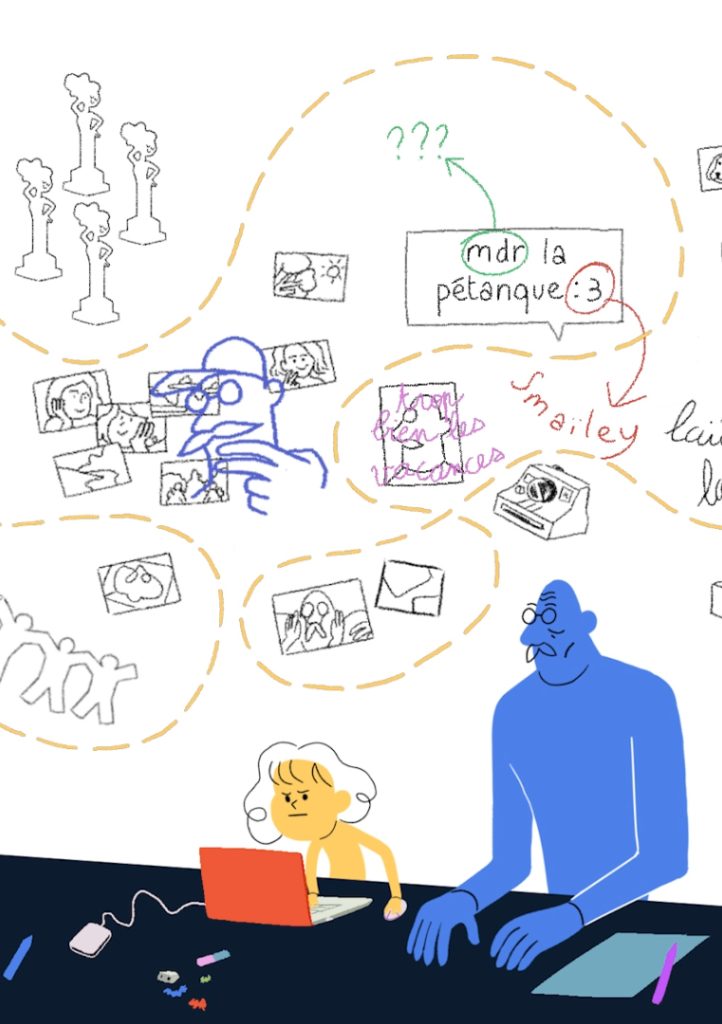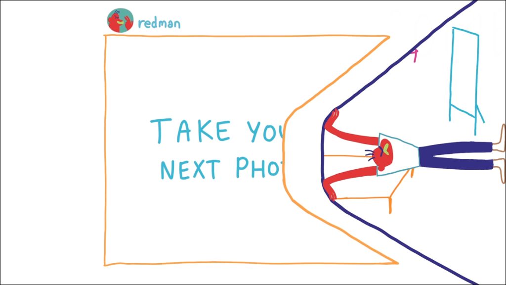 Les réseaux sociaux m’inspirent un visuel très graphique et épuré. Je me suis alors tourné vers les films du studio UPA pour chercher l’inspiration. Mais c’est en découvrant Surogat de Dušan Vukotić que mon idée s’est précisée. J’ai beaucoup aimé la possibilité d’interaction illimitée entre le protagoniste et les éléments du décor. C’est à ce moment que m’est venue l’idée de séparer l’écran en deux, à l’aide d’un split screen et de créer une interaction entre le personnage et ce dernier.