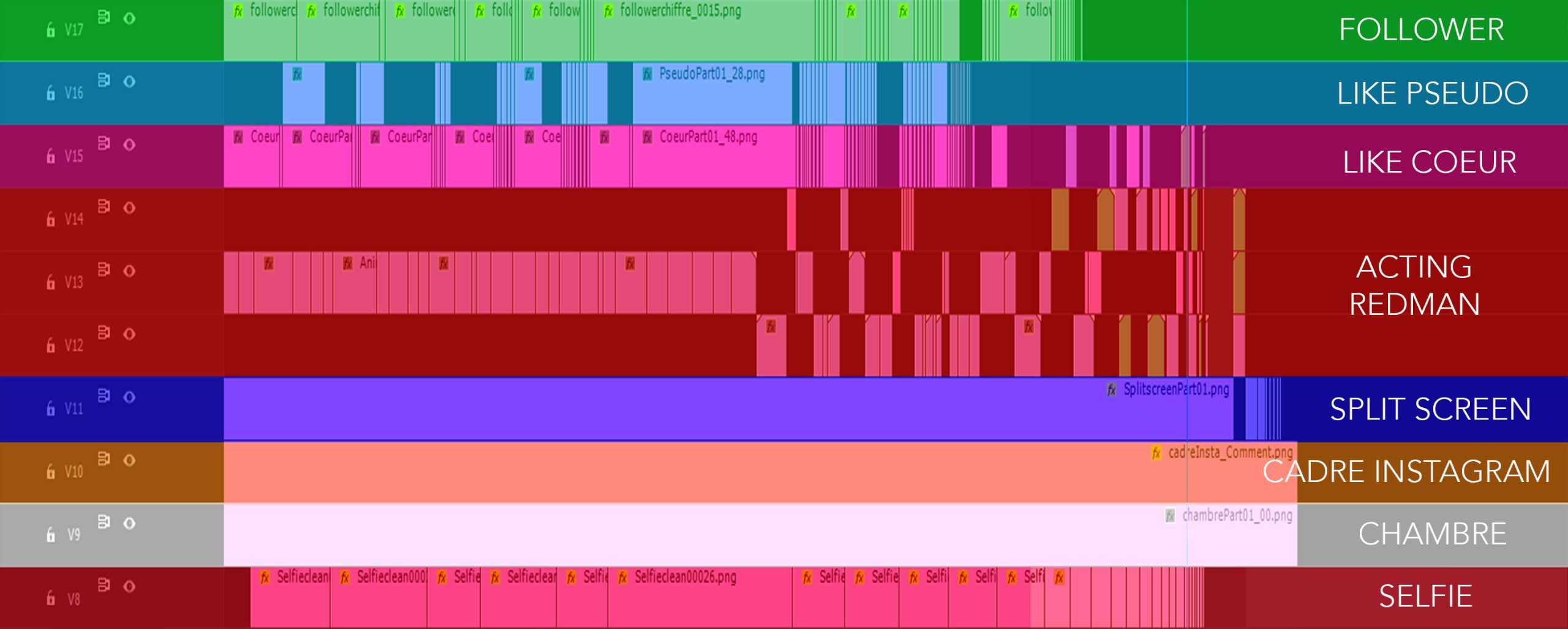 En travaillant sur mon animatique, je me suis principalement concentré sur le rythme. Notamment quand le personnage s’entraîne. Cette partie étant constituée de plusieurs boucles d’animation, je voulais me laisser la liberté de les déplacer facilement. Dans ce but, j’ai organisé mon espace de travail sur le logiciel de montage Premiere Pro de la façon suivante : chaque élément du projet est indépendant, cette flexibilité m’a permis de tester plusieurs montages différents assez rapidement. J’ai aussi fait attention à la superposition des pistes qui influe sur la profondeur de l’image, par exemple, la piste située le plus en haut apparaîtra au premier plan et inversement.